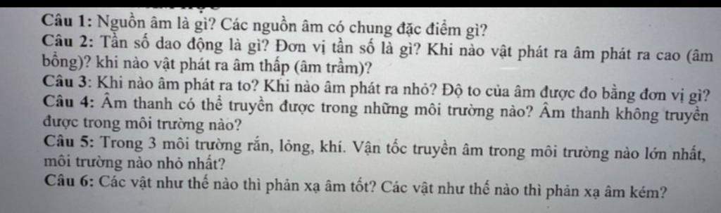 Câu 5: Trong 3 môi trường thì chất rắn truyền âm lớn nhất, môi trường chất lỏng truyền âm bé hơn chất rắn nhưng lại lớn hơn môi trường chất khí.