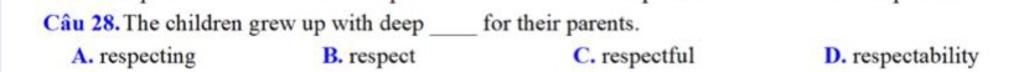 => ta xét đáp án: respectful (adj : tôn trọng , respecting (v): tôn trọng , respectfully (adv ): trân trọng , respect (n): kính trọng