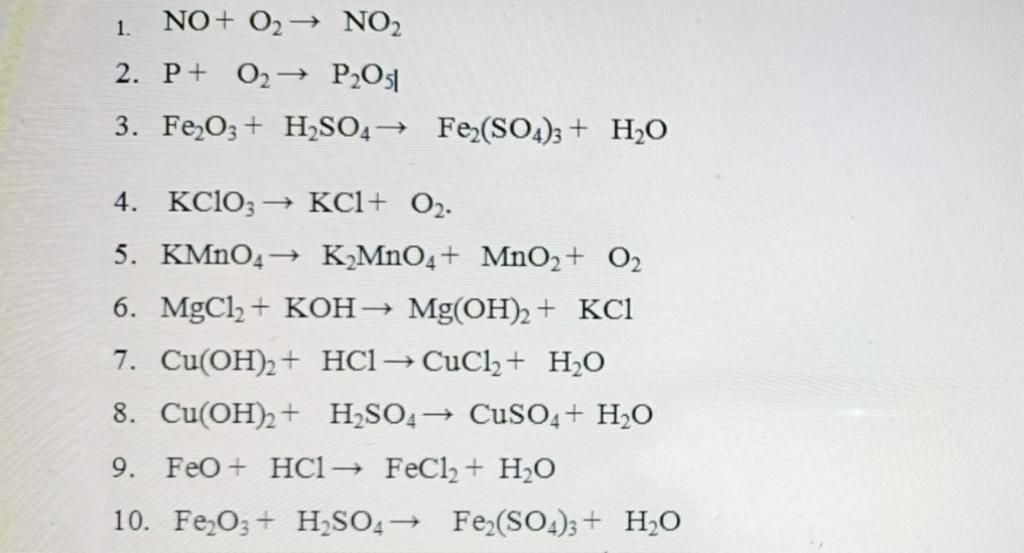 10) Fe2O3+3H2SO4-->Fe2(SO4)3+3H2O