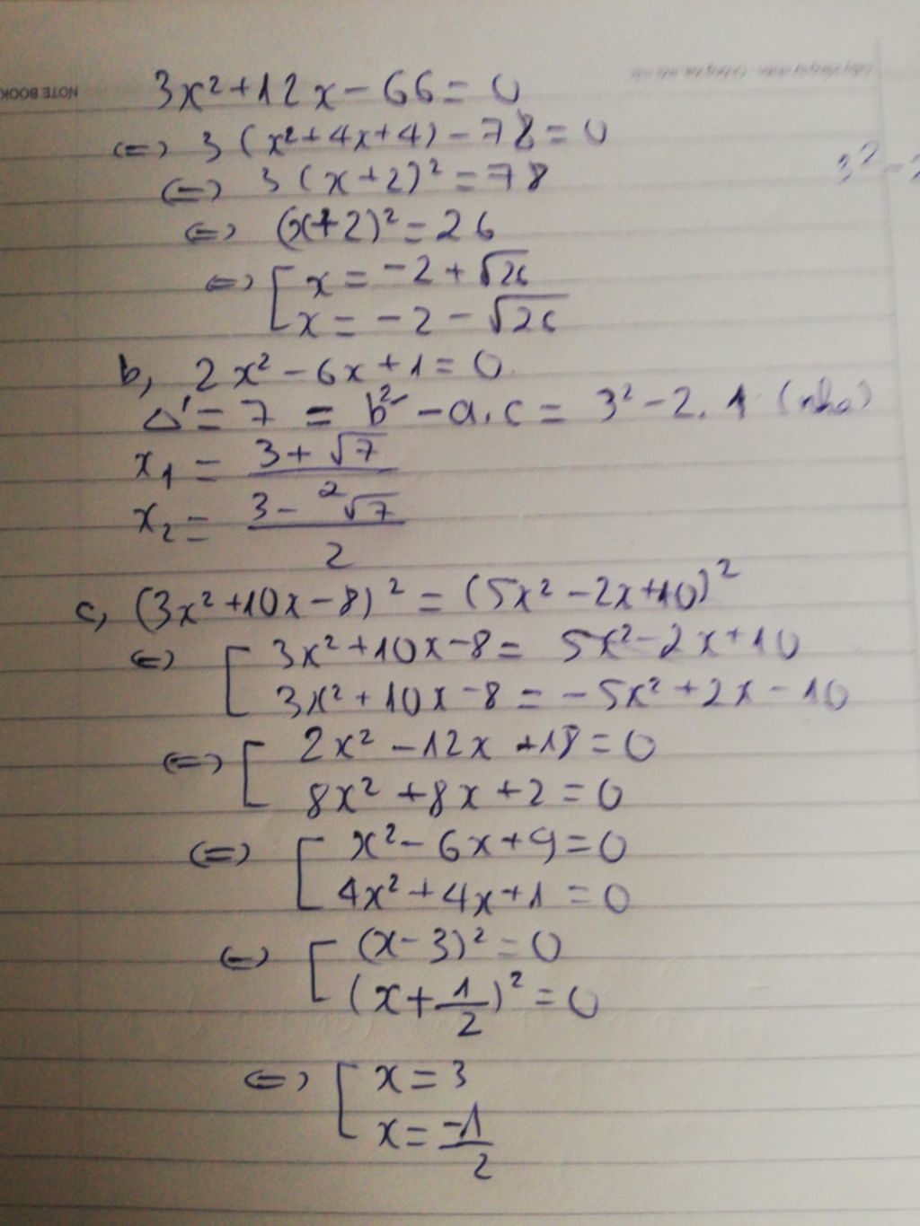 Đáp án:a)\(\left[ \begin{array}{l}x_{1}=\frac{-6+3\sqrt{26}}{3}=-2+\sqrt{26}\\x_{2}=\frac{-6-3\sqrt{26}}{3}=-2-\sqrt{26}\end{array} \right.\)