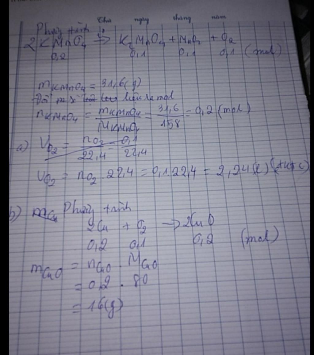 Có $\text{nKMnO4=$\dfrac{31,6}{158}$=0,2 mol}$