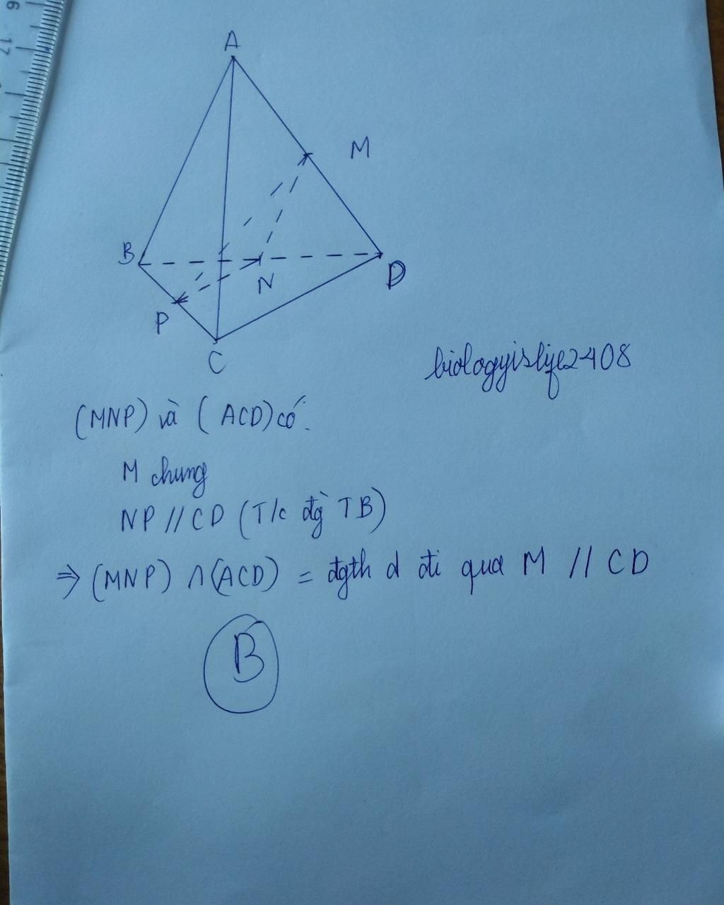Cho tứ diện ABCD có M, N, P lần lượt là trung điểm của các cạnh AD, BC và BD . Gọi đường thẳng d là giao tuyển của mặt phẳng (MNP) và mặt phẳng (ACD) . Khẳng định nào sau đây đúng?
