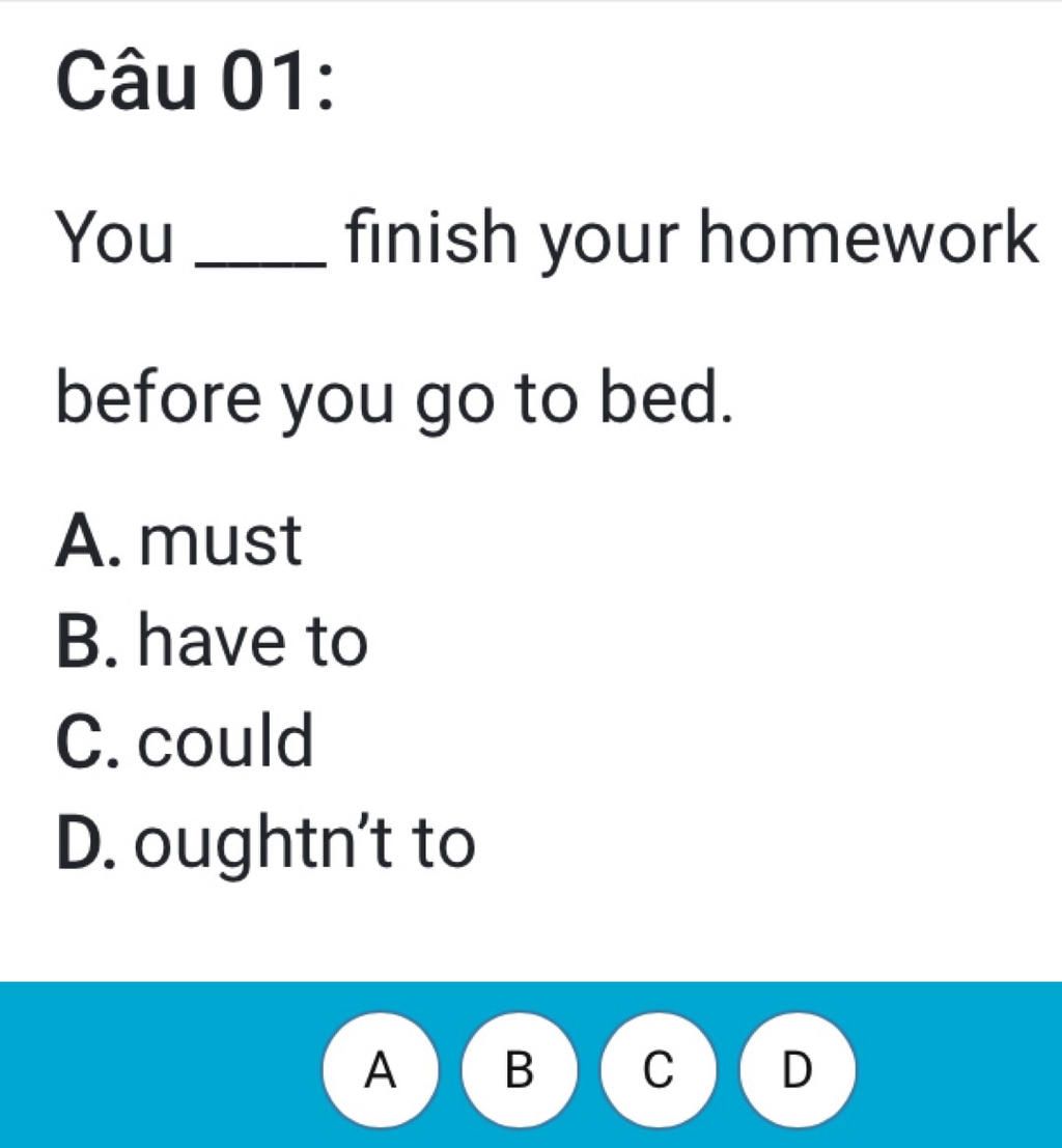 (Bạn phải hoàn thành bài tập về nhà trước khi đi ngủ)