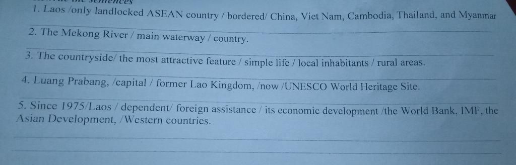 1. Laos /only landlocked ASEAN country / bordered/ China, Viet Nam, Cambodia, Thailand, and Myanmar