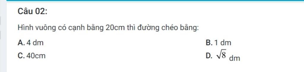 \sqrt {{{20}^2} + {{20}^2}} = 20\sqrt 2 \left( {cm} \right) = 2\sqrt 2 = \sqrt 8 \left( {dm} \right)\\