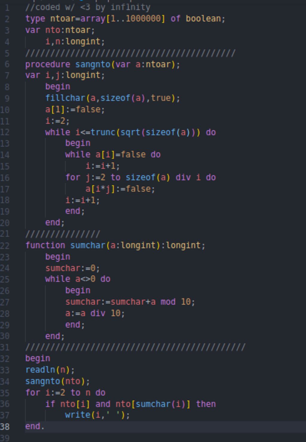 - Chạy 1 vòng for từ 2 đến n, tính tổng chữ số của i và xét trong mảng nguyên tố vừa tạo xem cả 2 có phải số nguyên tố không, nếu có thì in ra i.