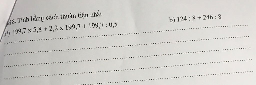 `a)199,7 xx 5,8 + 2,2 xx 199,7 + 199,7 : 0,5`