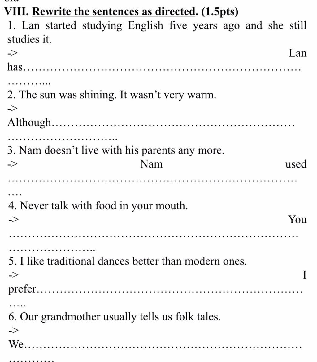 6. We are usually told folk tales by our grandmother. (Chuyển câu bị động "tobe + past participle" với chủ ngữ "we")