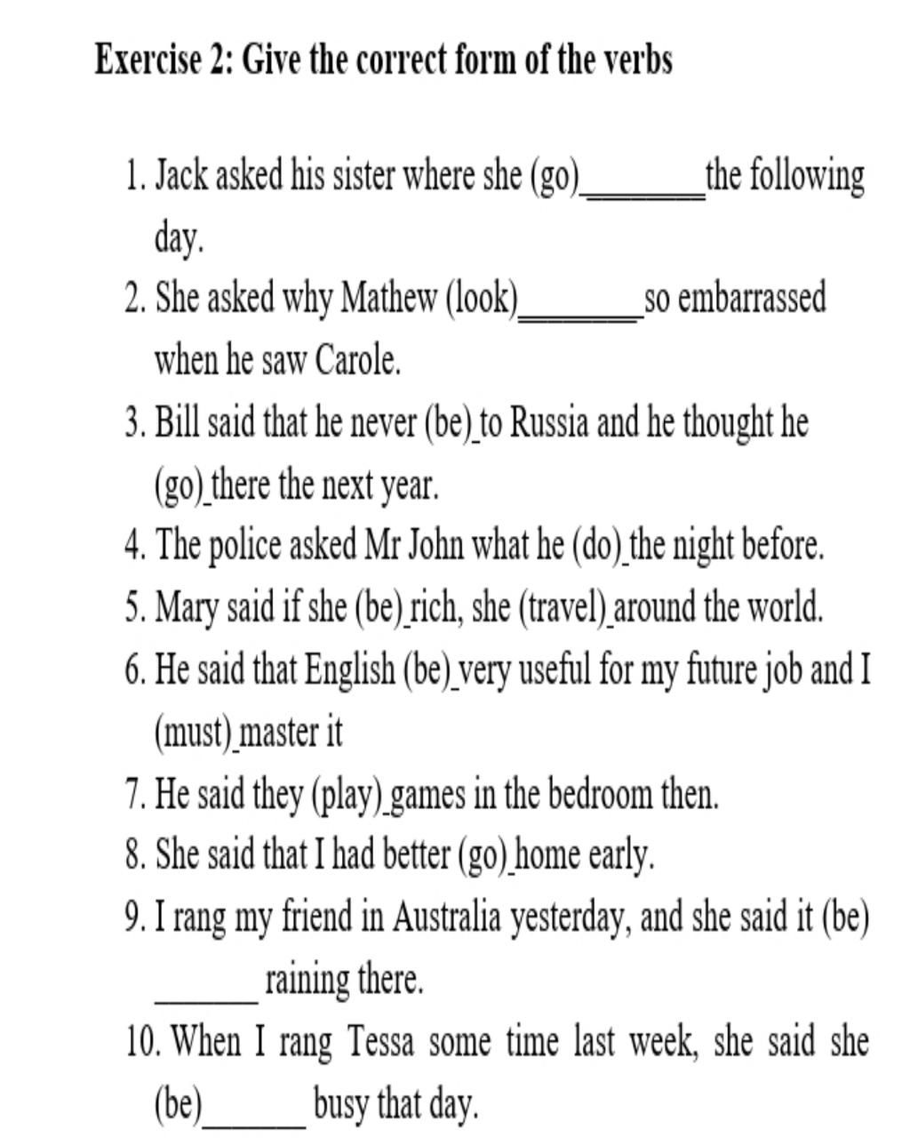 3.Bill said that he never (be) been to Russia and he thought he (go)would go there the next year
