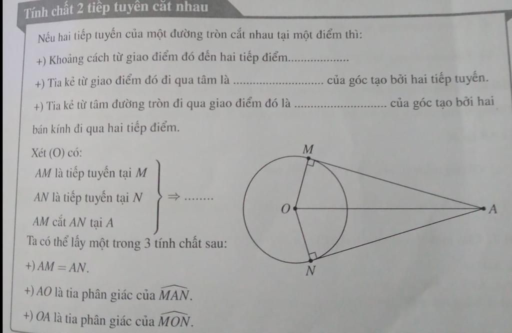 $+)$ Tia kẻ từ tâm đường tròn đi qua giao điểm đó là tia phân giác của góc tạo bởi hai bán kính đi qua hai tiếp điểm