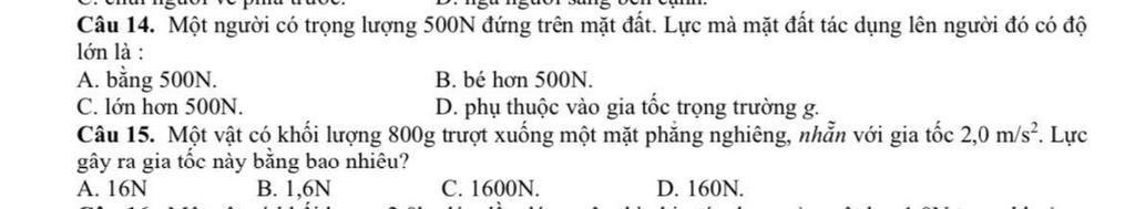 Câu 14. Một người có trọng lượng 500N đứng trên mặt đất. Lực mà mặt đất tác dụng lên người đó có độ
