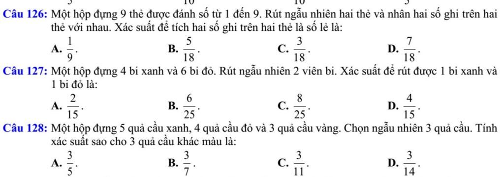 Câu 126: Một hộp đựng 9 thẻ được đánh số từ 1 đến 9. Rút ngẫu nhiên hai thẻ và nhân hai số ghi trên hai
