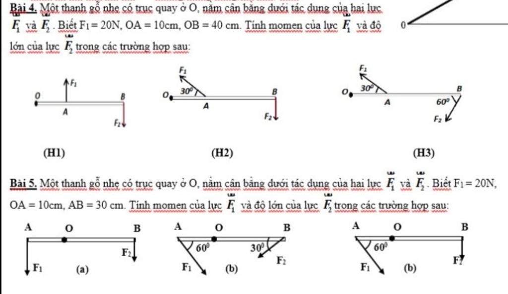 Bài 4. Một thanh gỗ nhe có trục quay ở O, nằm cân bằng dưới tác dung của hai luc.