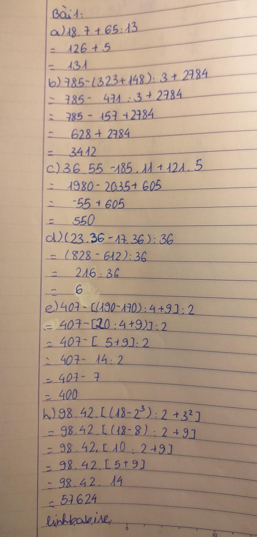 8.7+65:13= 18.7 + 5= 126 + 5= 131b) 785-(323+148):3+2784= 785 - 157 + 2784= 2789