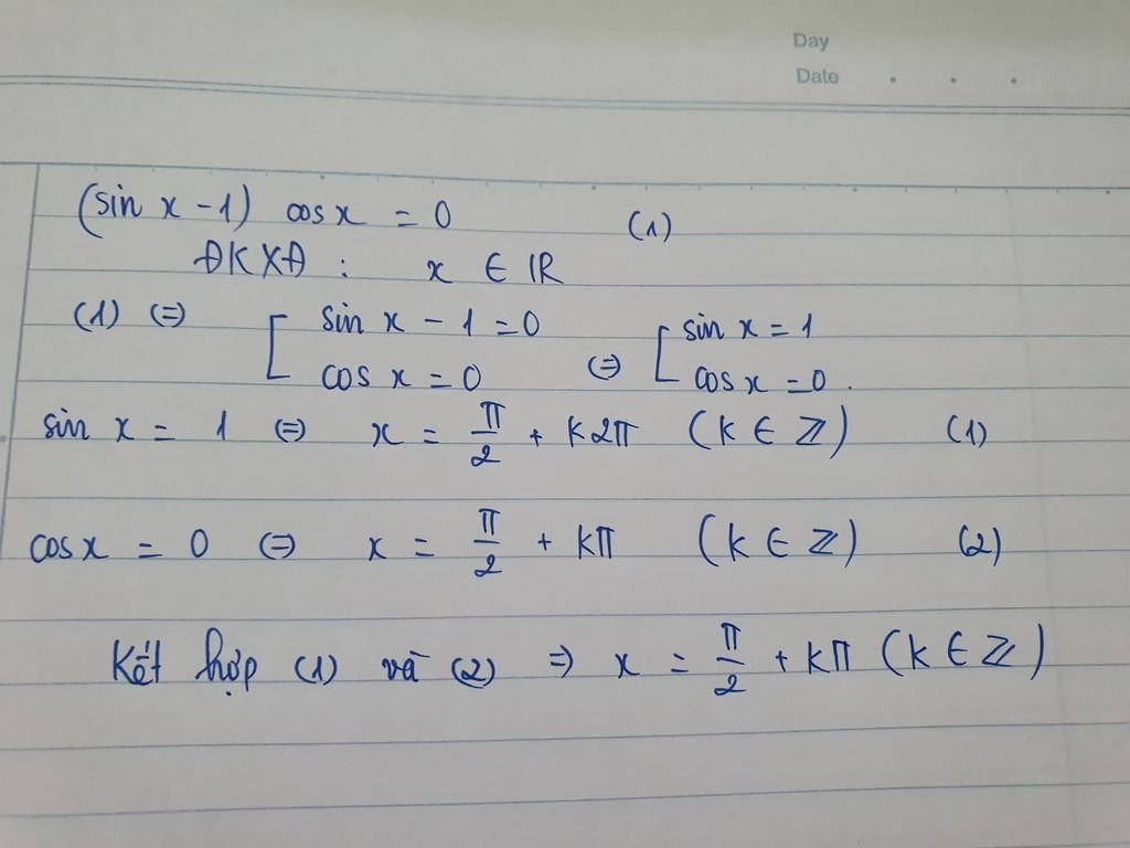$\begin{array}{l} \left( {\sin x - 1} \right).\cos x = 0\\ \Rightarrow \left[ \begin{array}{l} \sin x - 1 = 0\\ \cos x = 0 \end{array} \right. \Rightarrow \left[ \begin{array}{l} \sin x = 1\\ x = \frac{\pi }{2} + k\pi \end{array} \right. \Rightarrow \left[ \begin{array}{l} x = \frac{\pi }{2} + k2\pi \\ x = \frac{\pi }{2} + k\pi \end{array} \right. \end{array}$