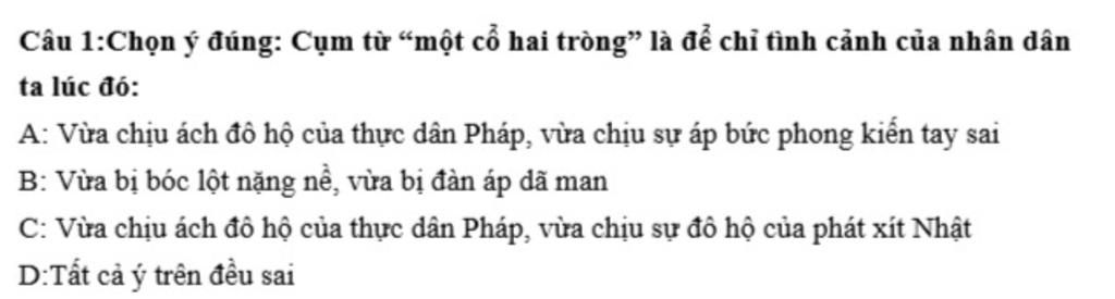 Câu 1;Chọn ý đúng;Cụm từ một cổ hai tròng là để chỉ tình cảnh của nhân dân ta lúc đó