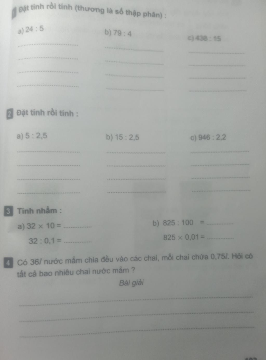 `36 : 0,75 = 48` `(` chai `)`