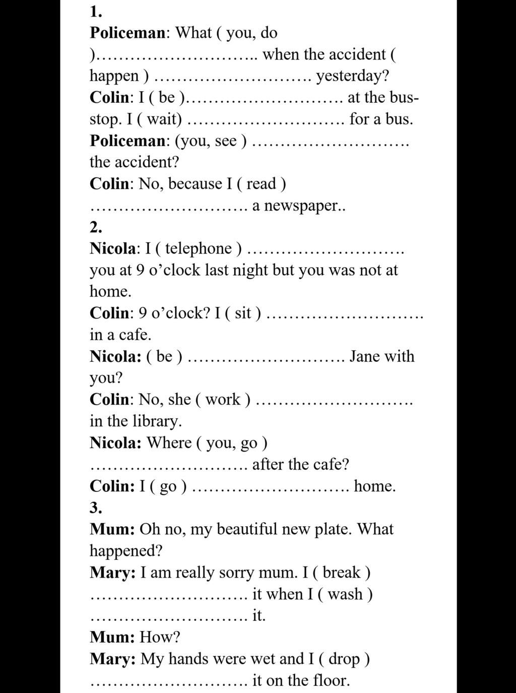 1.POLICEMAN: What were you doing (you/do) when the accident happened(happen)?