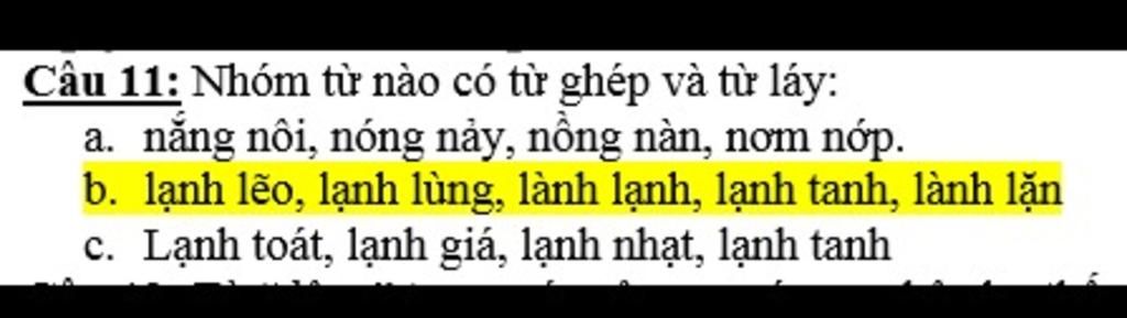 Câu 11: Nhóm từ có từ ghép và từ láy là: b. Lạnh lẽo, lạnh lùng, lành lạnh, lạnh tanh, lành lặn