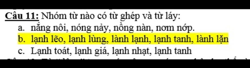 - Phần B chứa cả từ láy và từ ghép. ( từ ghép là từ "lạnh tanh" mình đã chỉ ở trên, còn từ láy là các từ còn lại.)