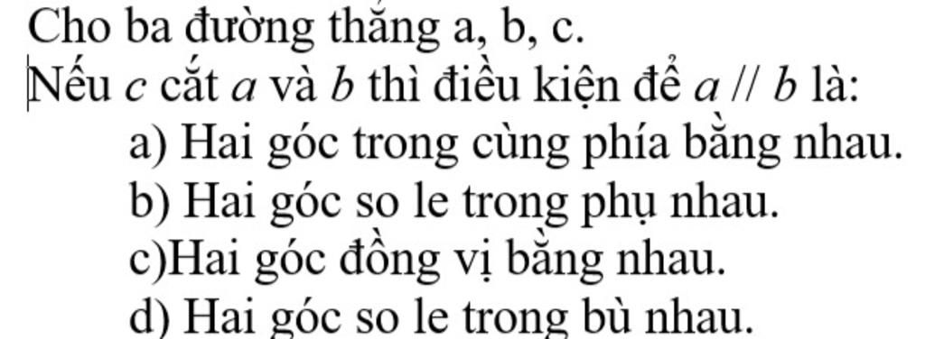 Nếu c cắt a và b thì điều kiện để a//b là có hai góc đồng vị bằng nhau.