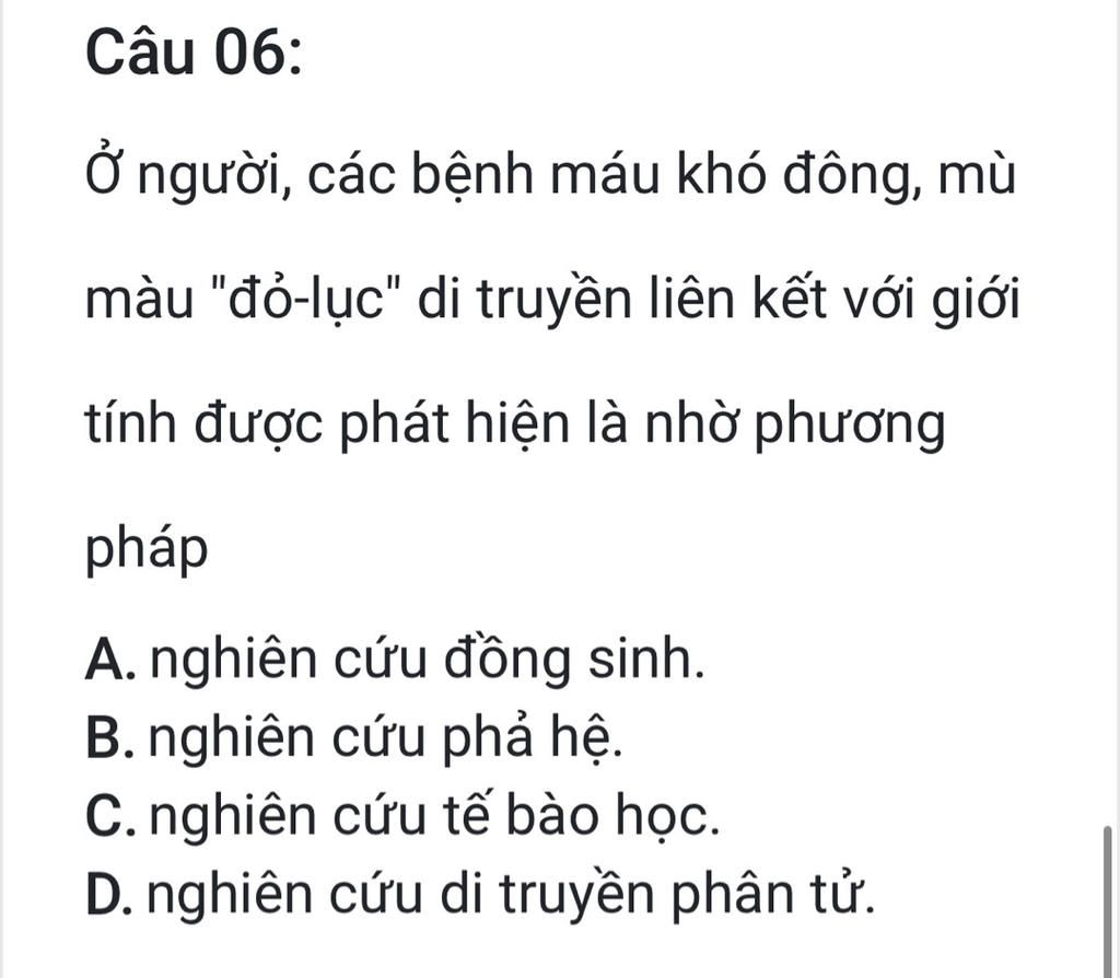 Câu hỏi : ở người , các bệnh máu khó đông , mù màu “ đỏ - lục “ di chuyển liên kết với giới tính được phát hiện là nhờ phương pháp ? Đáp án : B nghiên cứu phả hệ. Vì : ở người , các bệnh máu khó đông , mù màu “ đỏ - lục “ di chuyển liên kết với giới tính được phát hiện là phương pháp nghiên cứu phả hệ