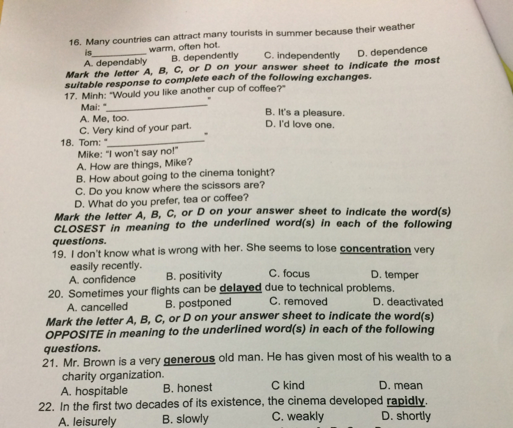 Mark the letter A, B, C, or D on your answer sheet to indicate the most