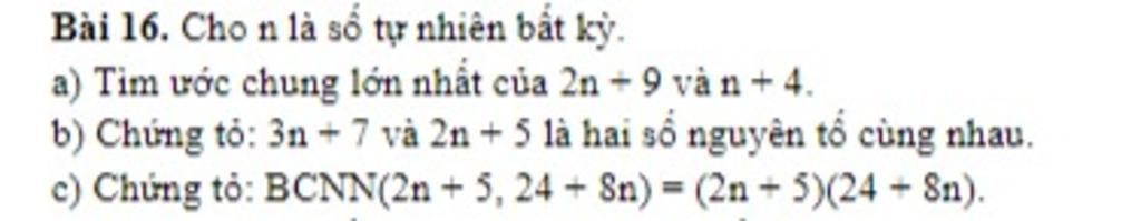 $\text{Gọi x là ƯCLN(2n+5,8n+24)}$ $\\$ $\text{Ta có: 2n+5 ⋮ x}$ $\\$ $\text{⇔ 4(2n+5) ⋮ x}$ $\\$ $\text{⇔ 8n+20 ⋮ x và 8n+24 ⋮ x}$ $\\$ $\text{⇔ 8n + 24 – (8n + 20) ⋮ x}$ $\\$ $\text{⇔ 4 ⋮ x}$ $\\$ $\text{⇔ x ∈ {1;2;4}}$ $\\$ $\text{Do 2n là số chẵn ⇒ 2n + 5 là số lẻ }$ $\\$ $\text{⇒ x = 1}$ $\\$ $\text{Vì ƯCLN(2n+5 , 8n+24) =1}$ $\\$ $\text{⇒BCNN(2n+5,8n + 24) = (2n+5)(8n+24).}$