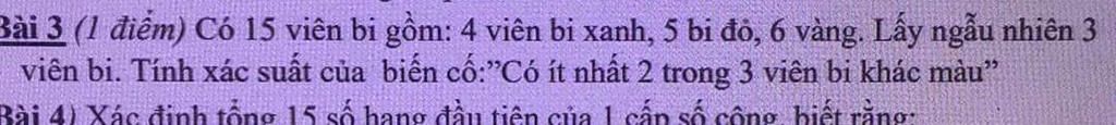 Gọi $A$ là biến cố: "Lấy được ít nhất `2` trong `3` viên vi khác màu"