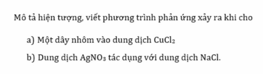 `a)` Hiện tượng: Dây nhôm tan dần, dung dịch màu xanh lam chuyển dần thành trong suốt, sau phản ứng có lớp kim loại màu đỏ bám trên dây nhôm.