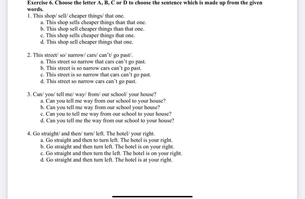 Exercise 6. Choose the letter A, B, C or D to choose the sentence which is made up from the given words.
