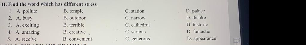2.D vì disˈlīk có trọng âm vào âm tiết 2 , các từ còn lại vào âm tiết 1: ˈbizē ;ˈoutˌdôr; ˈnerō,