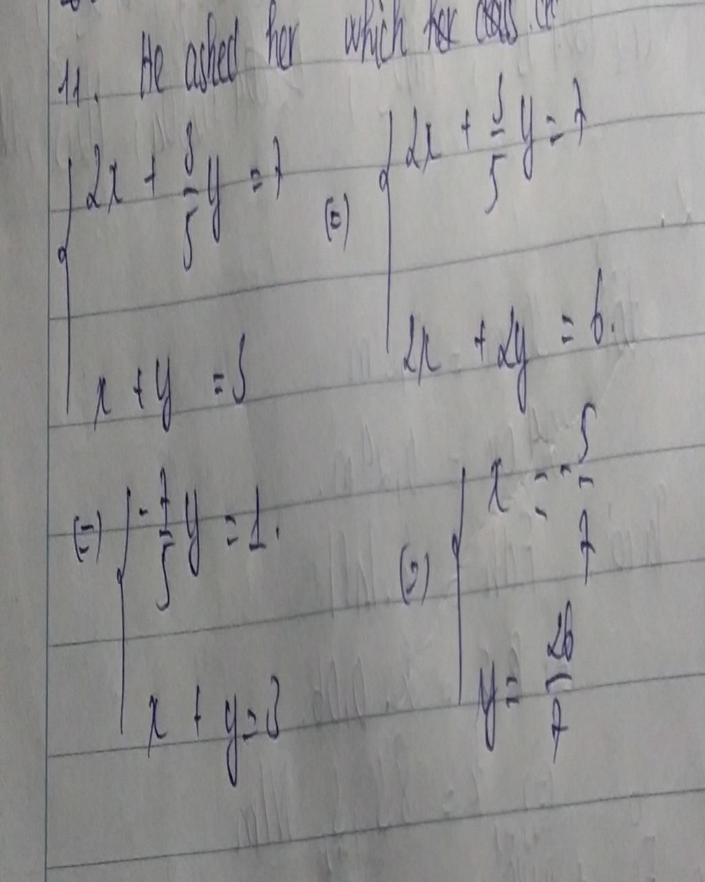 $\\$ $\left\{ {{2x+\frac{3}{5}y=7} \atop {x+y=3}} \right.$