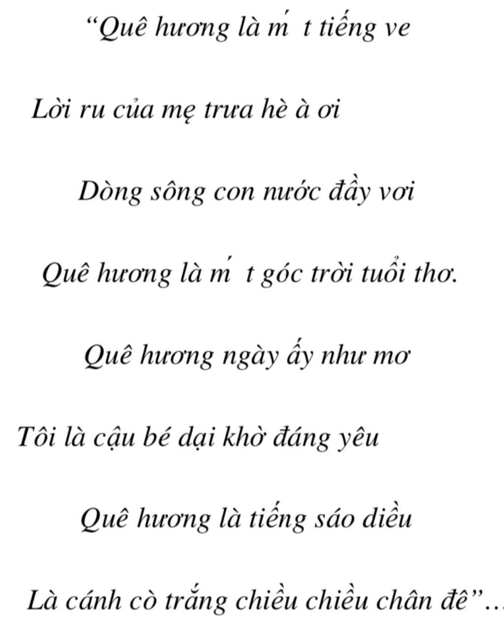 Câu 3 : biện pháp tu từ là điệp từ quê hương giúp cho đoạn văn trở nên dễ thuộc và nhấn mạnh chủ đề mà đoạn văn muốn nhắc đến