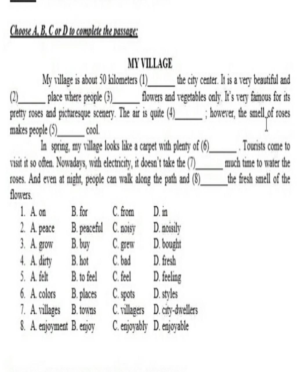 My village is about 50 kilometers from the city center. It is a very beautiful and peaceful place where people grow flowers and vegetables every day. It is very famous for its pretty roses and picturesque scenes. The air is very fresh, however, the smell of roses makes people cool. In spring, my village looks like a carpet with plenty of colors. Tourists come to visit it so often. Nowadays, with electricity, it does not take the villagers much time to water the roses. And even at night, people can walk along the path and enjoy the fresh smell of the flowers.