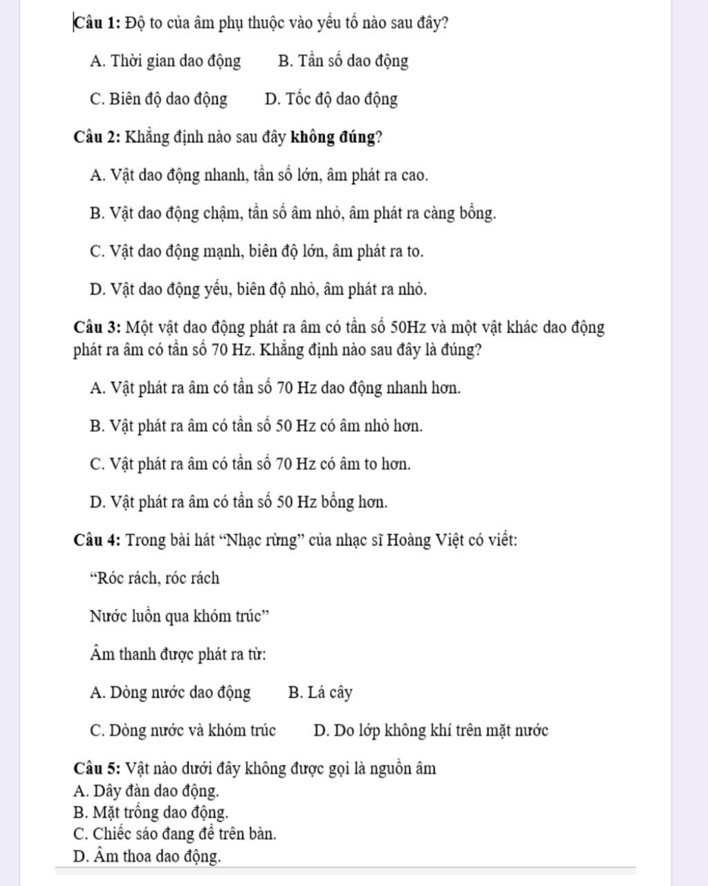 Vật dao động càng nhanh thì tần số dao động càng lớn, âm phát ra càng bổng.