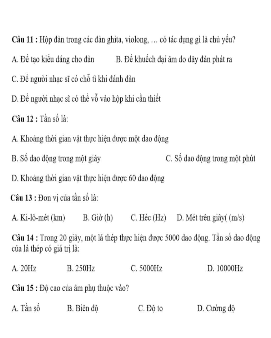 14. B 250hz → Tần số dao của lá thép là 5000/2 = 250 (hz)