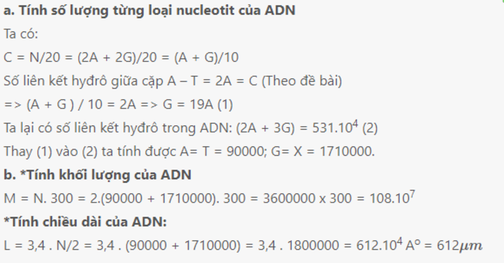 trong 1 phân tử ADN, số liên kết HIDRO ở giữa hai mạch đơn là 531.10*4 và số liên kết hidro trong các cặp A-T bằng số chu kỳ xoắn của nó trong phân tử