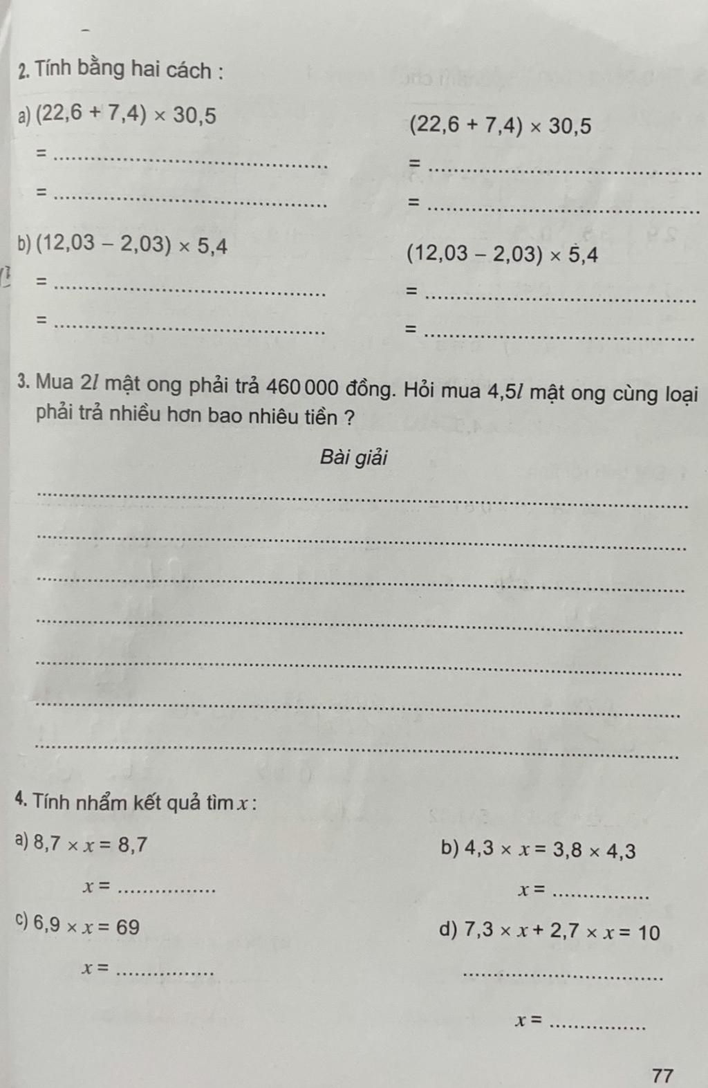Bài 3 trang 77 Vở bài tập Toán lớp 5 Tập 1: Mua 2l mật ong phải trả 460 000 đồng. Hỏi mua 4,5l mật ong cùng loại phải trả nhiều hơn bao nhiêu tiền?