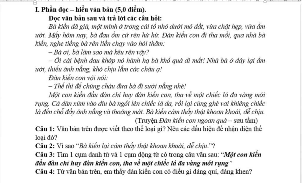 Câu 4: Đàn kiến con biết chăm lo cho bà khi bà đau nhức,chúng đã thể hiện là một đàn kiến hiếu thảo