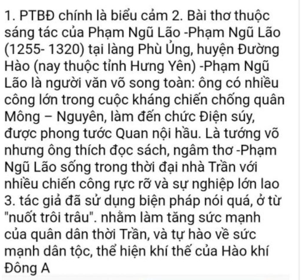 Câu 4:(tham khảo)Mở ra từng tranh sử hào hùng của dân tộc,nơi hào khí Đông A cao ngút trời, và cũng trong những trang sử ấy ta bắt gặp được người anh hùng Phạm Ngũ Lão với niềm khao khát dân tộc mãnh liệt được thể hiện trong bài thơ " Tỏ lòng "