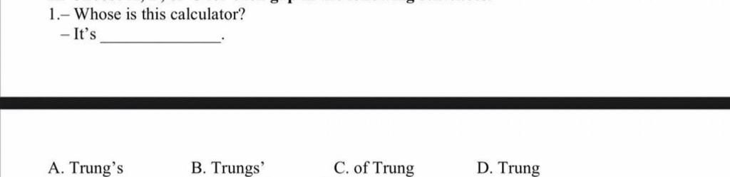 Giải thích : Để thể hiện sự sở hữu, cái này là máy tính của Trung thì ta cần dùng Trung’s