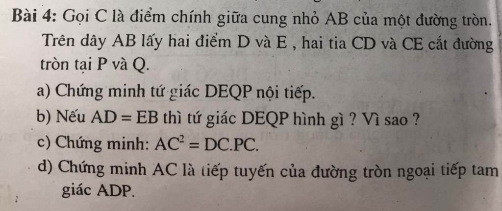d.Từ $\widehat{CAD}=\widehat{APD}\to CA$ là tiếp tuyến của đường tròn ngoại tiếp $\Delta APD$