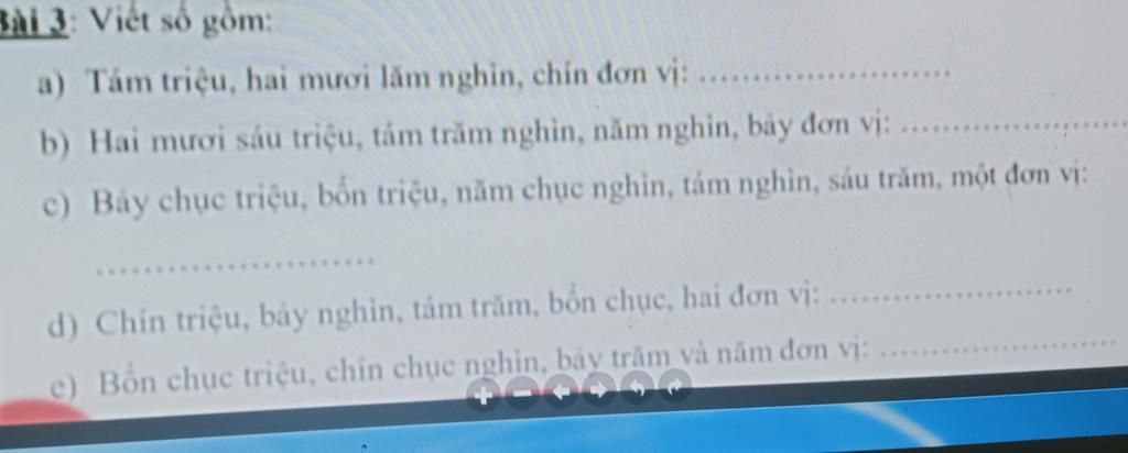 d) Chín triệu, bảy nghìn, tám trăm, bốn chục, hai đơn vị: 9 007 842
