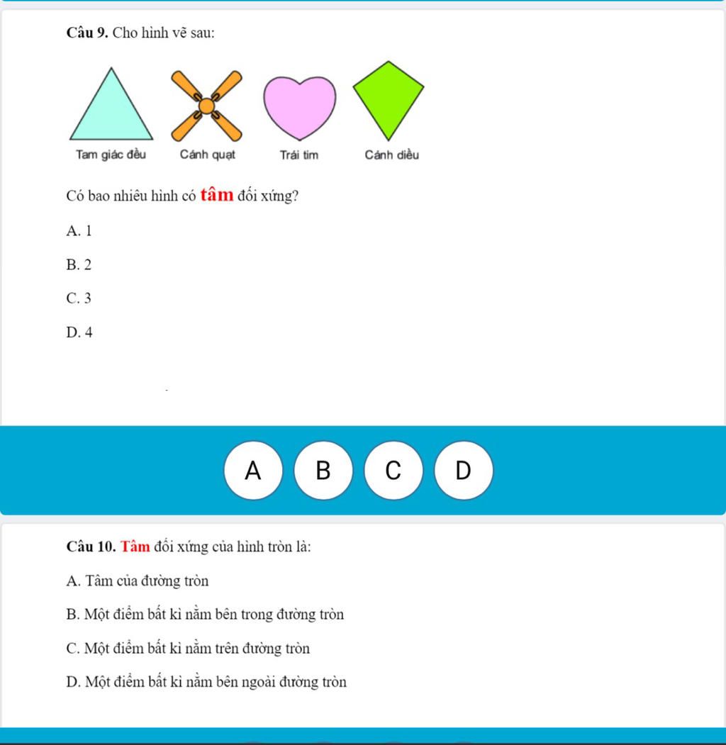 Câu 10. Tâm đối xứng của hình tròn là: