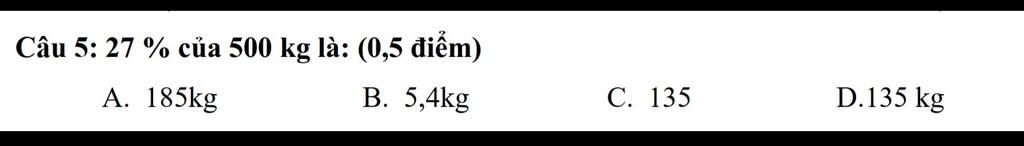 27% của 500kg=500.27/100=500/100.27=5.27=135kg chọn D