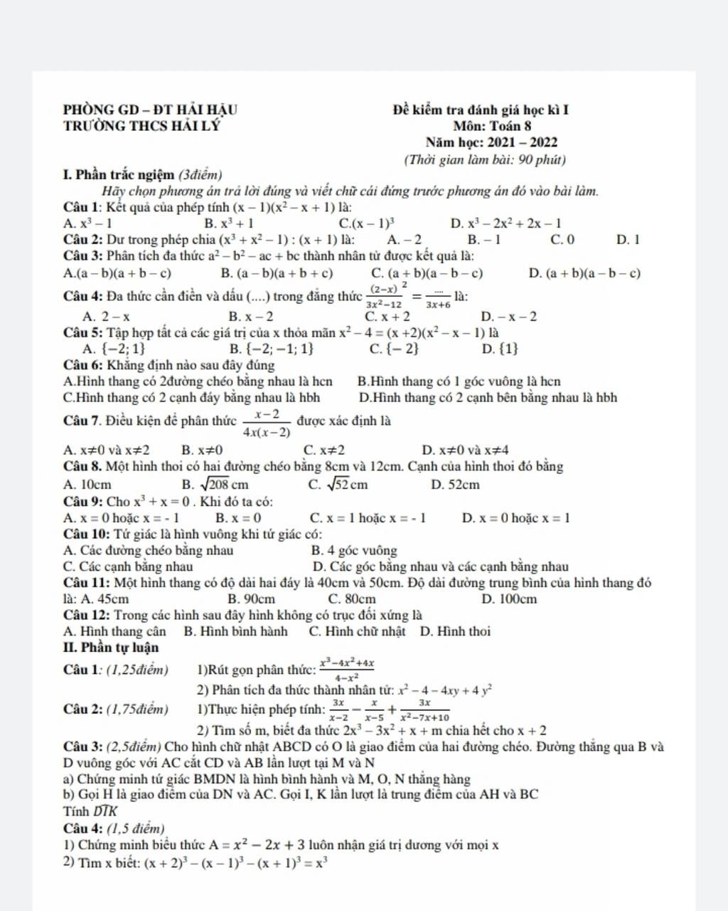 Câu 1: Kết quả của phép tính (x – 1)(x2 - ...
