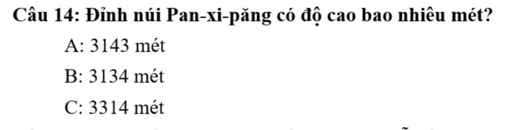 Câu 14: Đỉnh núi Phan-xi-păng có độ cao bao nhiêu mét?