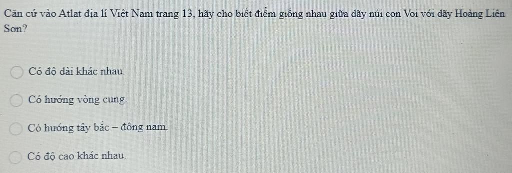 `->` Vì `:` Điểm giống nhau giữa dãy núi con Voi với dãy Hoàng Liên Sơn là có hướng Tây Bắc - Đông Nam`.`
