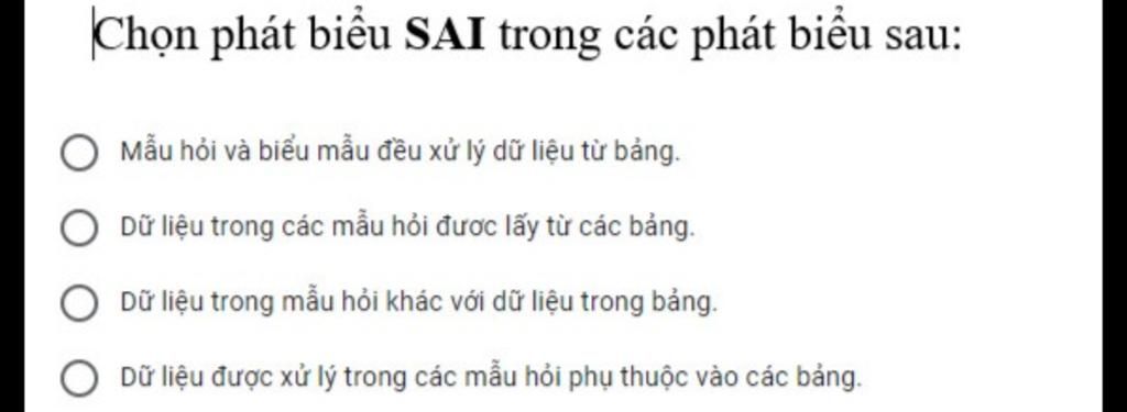+Dữ liệu trong các mẫu hỏi được lấy từ các bảng (đúng với phát biểu B)